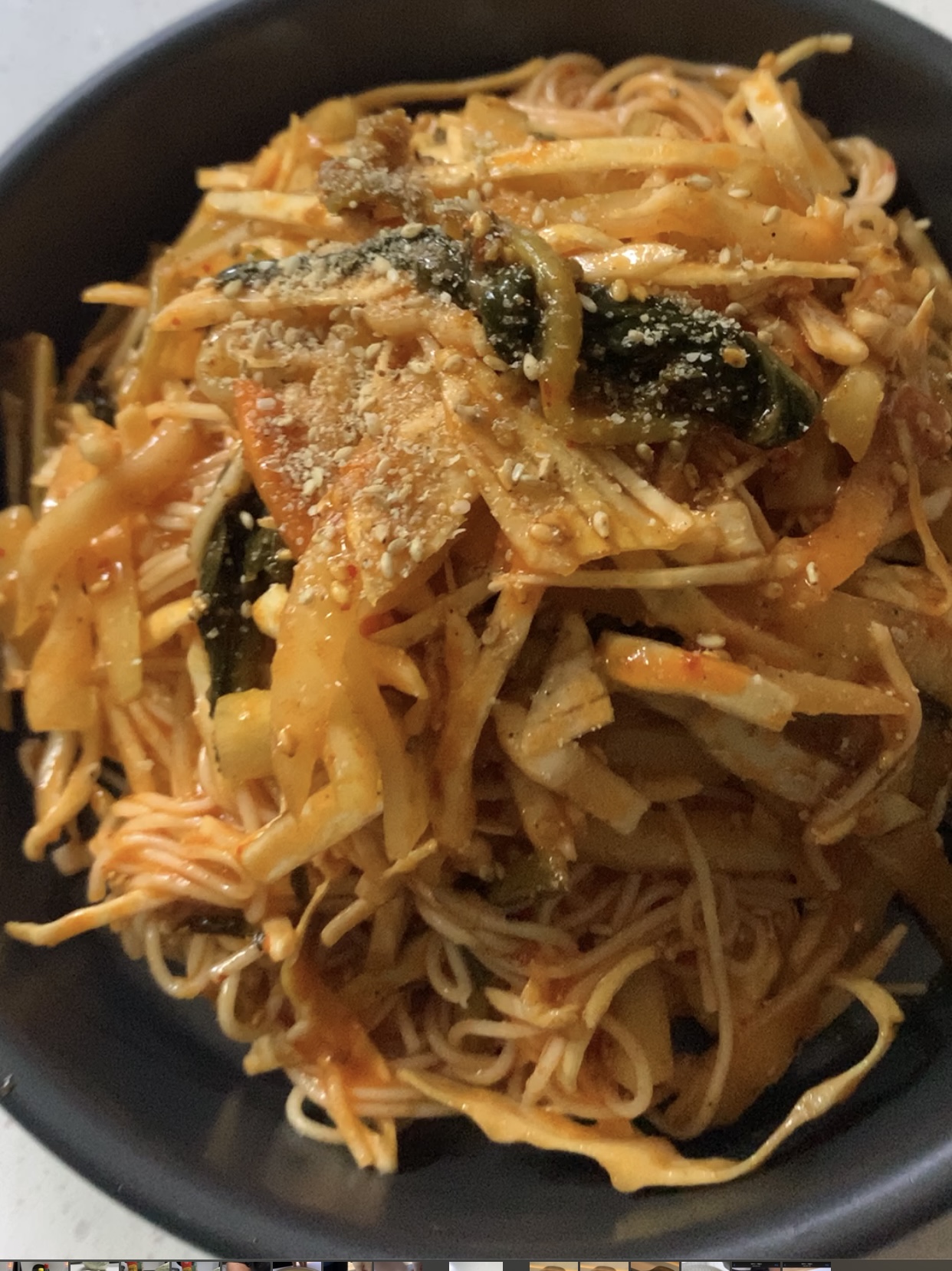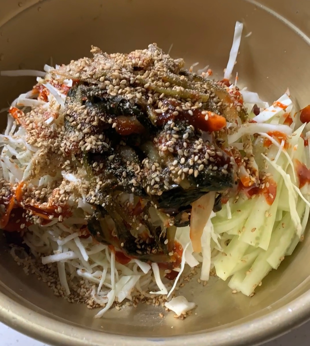 맛있게 조물조물 비벼 완성한 열무 비빔국수입니다.